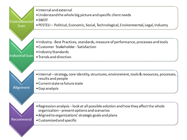Each organization is different. We believe the best solution comes from fully understanding your distinct situation and options available. We achieve this by assessing your organizations’ alignment with your core identity (strategy, vision, mission, culture and goals). We look at the overall environment in addition to your internal organization to get an understanding of all the factors and get the most accurate analysis of the evaluation results.