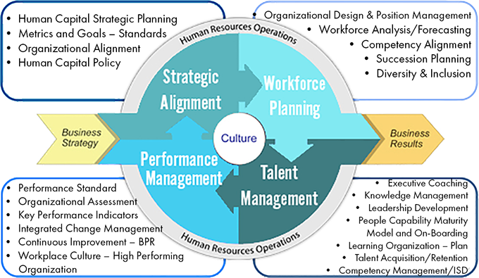 Our Human Capital Management Framework begins by ensuring that all affected policies, strategies, and resources are aligned to execute your organization’s human capital plan. The development of your human capital plan with relevant and appropriate goals is only the first step.